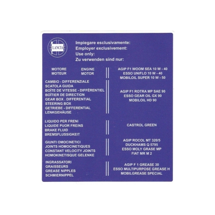 Sticker with the kind of liquid to use. Positioned in the engine compartment of Lancia Fulvia 2° series