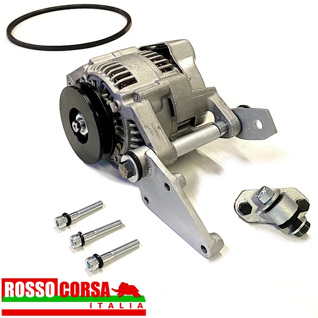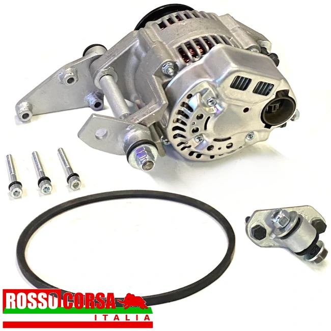 Kit for mounting the 14V 50Ah alternator on the Lancia Fulvia 1st series, which has the dynamo generator installed as standard. The kit includes all the useful and necessary parts for assembly, including the 50Ah alternator, the original dynamo bracket is used to adjust the belt tension. Please note that modifications to the vehicle’s electrical system are required, and that the installation of an electric cooling fan on the radiator is necessary for engine cooling.
