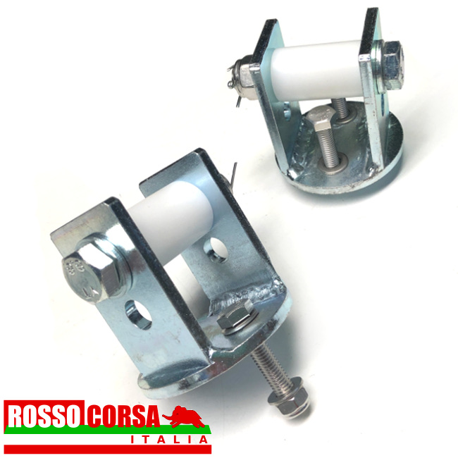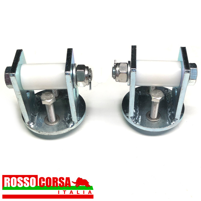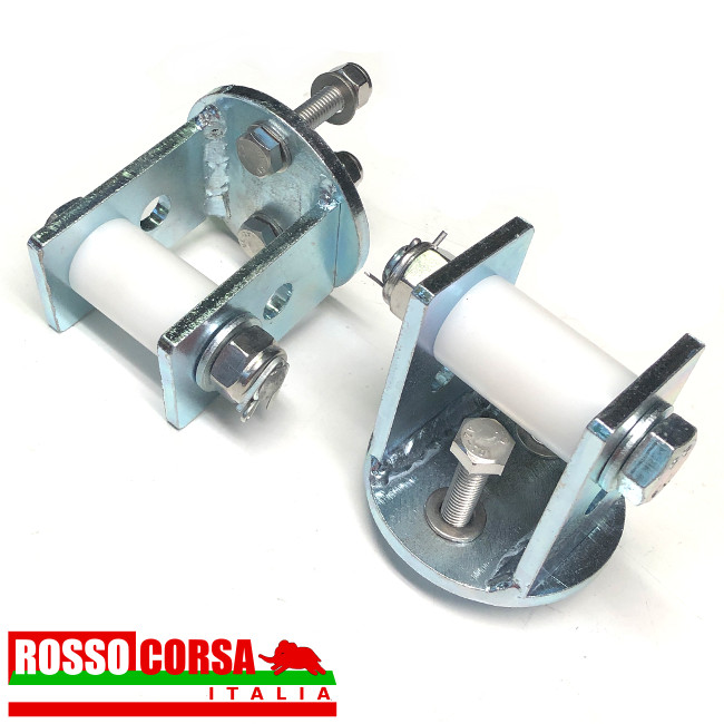 Front leaf spring rollers for the Lancia Fulvia 1st series, featuring the crossmember housing the short front leaf spring, with the end stop buffer located low down, which acts on the lower suspension arm. They replace the original rubber buffers. Increases the smoothness and efficiency of the leaf spring. They facilitate front height adjustment. With Teflon rollers