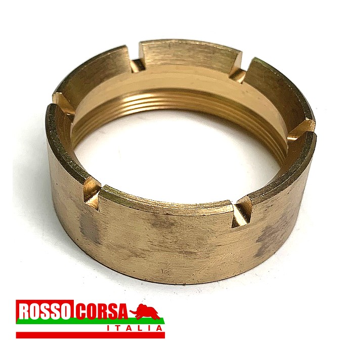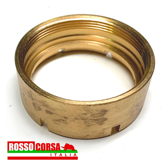 Ring nut for fixing the fuel tank filler neck for Lancia Fulvia 1st series. Made of brass.