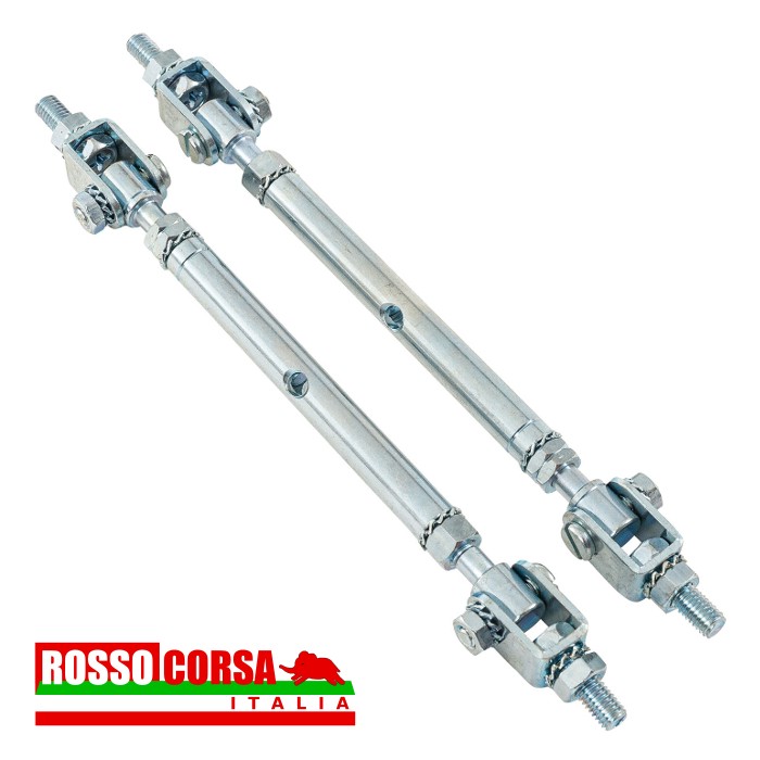 Coppia di tiranti faro in acciaio zincato. Sezione centrale con filettatura sinistra e destra. Regolazione facile e precisa del faro senza allentare il tirante. Regolabile da 130 a 195 mm