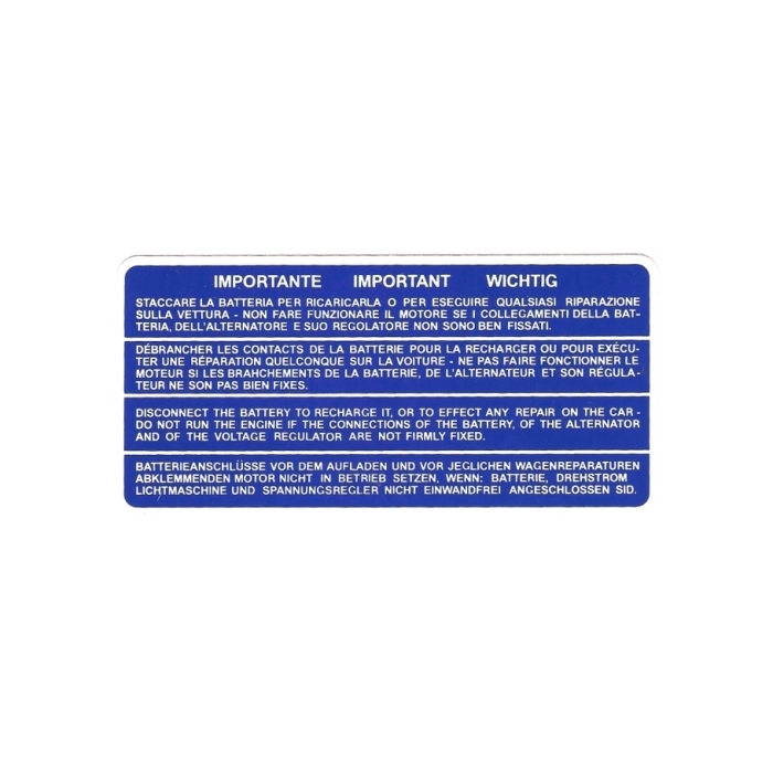 Sticker with instructions on the use of battery.Positioned in the engine compartment of Lancia Fulvia 2nd series