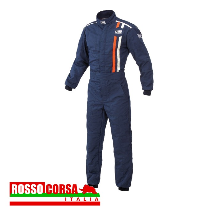 Two layer suit in vintage tipically ’70 design, given by the two vertical stripes on the chest. Inner collar in soft knitted fabric. Outer layer in fire-retardant fiber, inner layer in comfortable breathable knitted fabric. Cream colour with light blu and orange vertical stripes, navy blue with orange and cream vertical stripes. With new anti counterfeiting hologram
