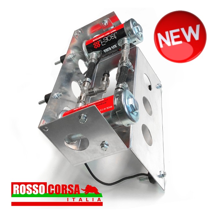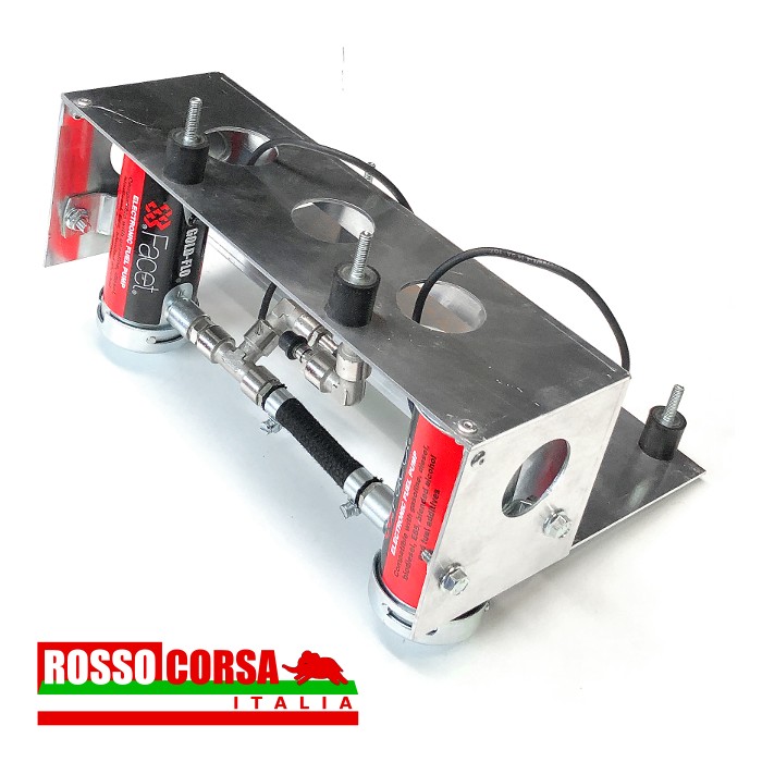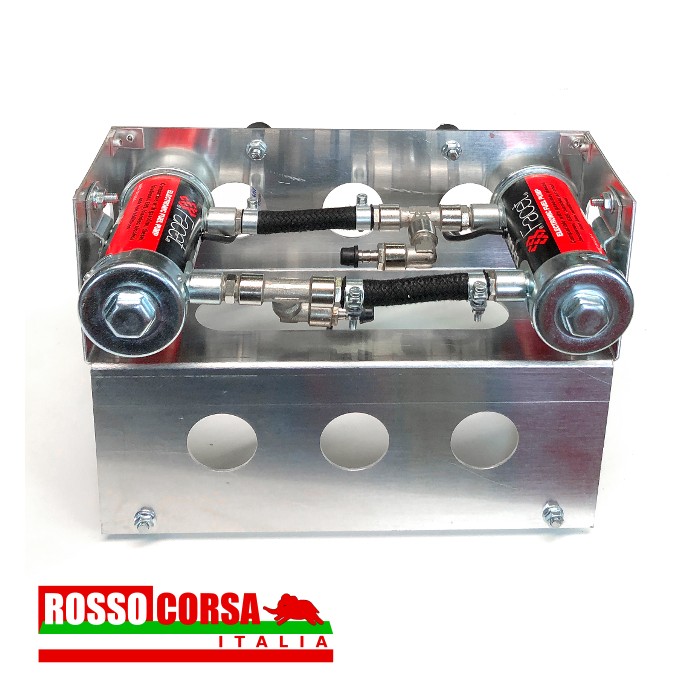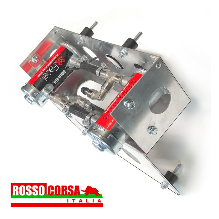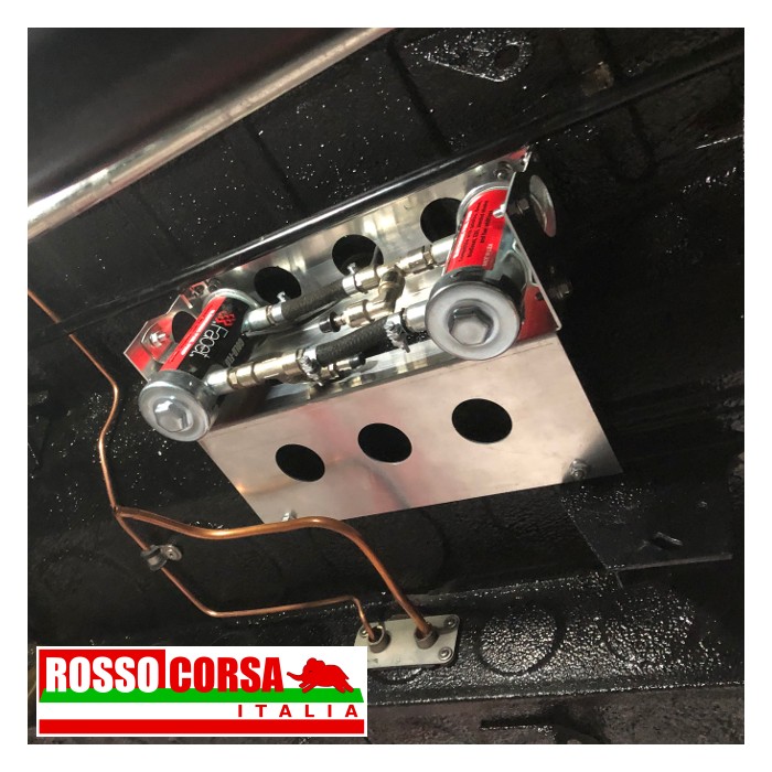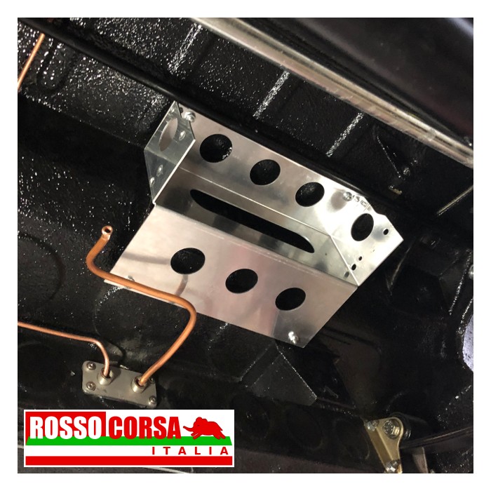 Aluminum mounting bracket to install a couple of CORSA electric fuel pumps under the body of the Lancia Fulvia. The support is positioned in the central rear part. This support can only be used on cars equipped with exhaust systems without a central silencer.
