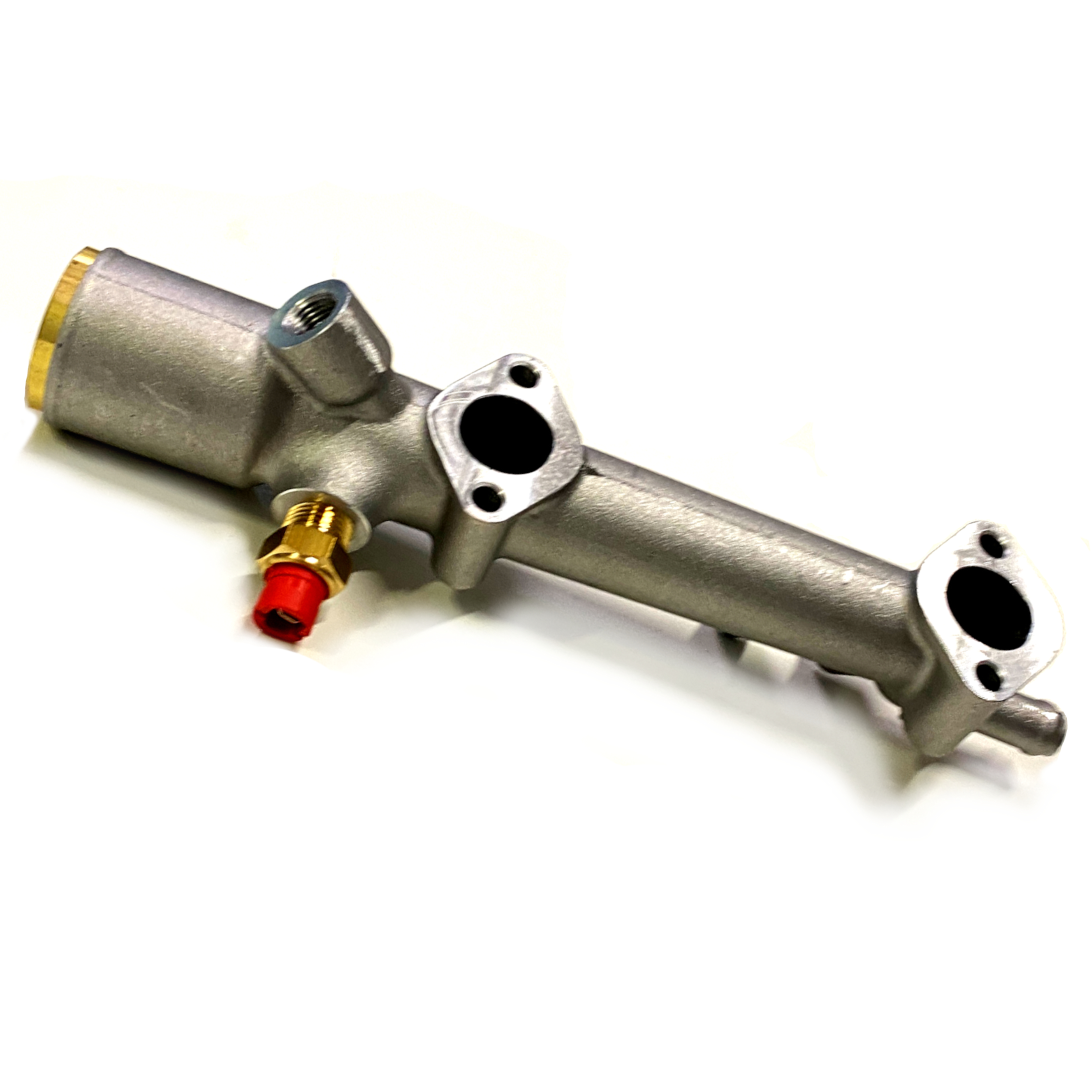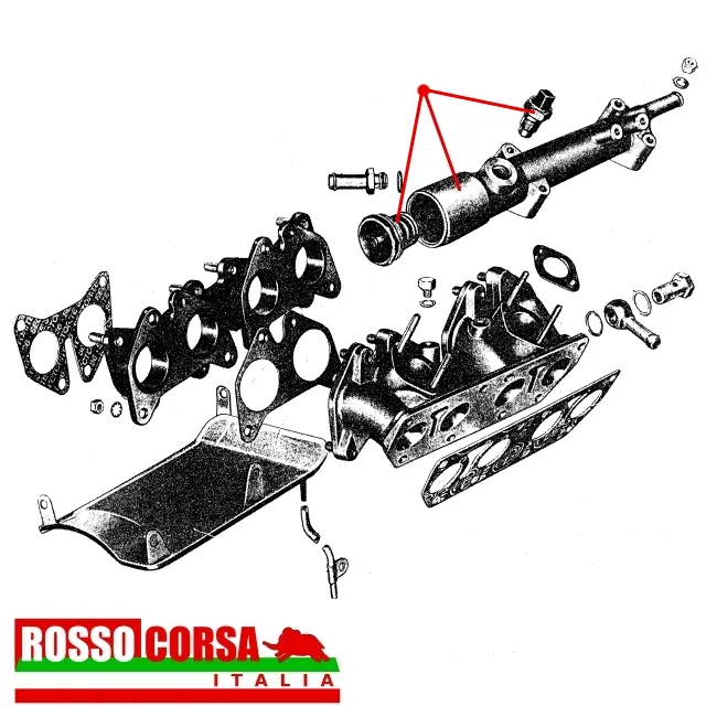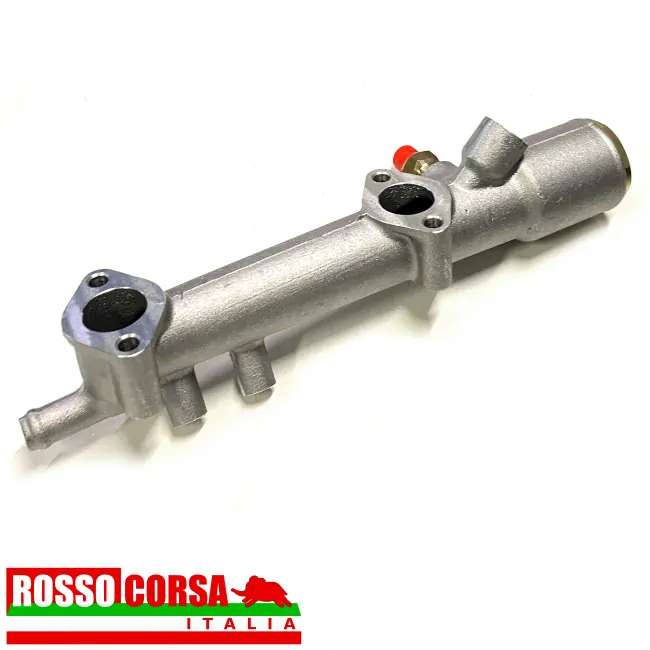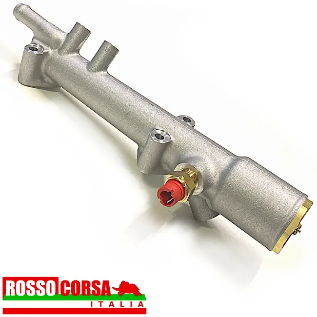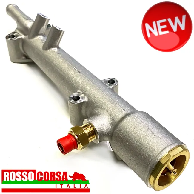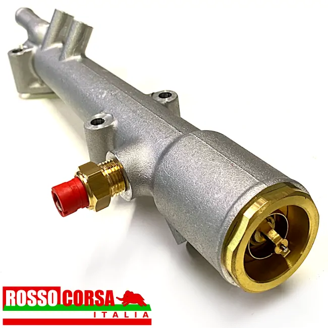 Lancia Fulvia thermostat housing. New, replica identical to the original, but with the water temperature bulb connection moved to the side to prevent the formation of air bubbles in the system. The hose outlet towards the heating system has a diameter of 14mm and therefore it can be mounted on both the 1st and 2nd series