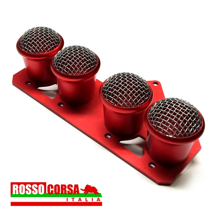 Tromboncini dritti in alluminio con retina per carburatori Solex C35 PHH e PHHE. Con piastra di fissaggio. Anodizzati rossi