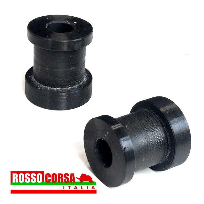 Coppia di boccole in gomma dura per l’attacco laterale della barra antirollio anteriore. Le boccole da noi fornite vanno a sostituire la parte in gomma del supporto esterno della barra antirollio. Aumentando la rigidezza del supporto incrementano l’efficacia del lavoro svolto della barra.