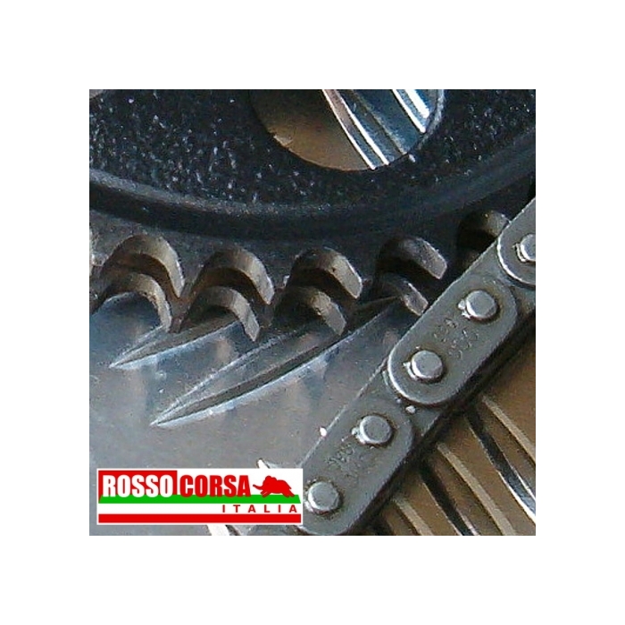 N.B.: per distinguere facilmente il diametro dei rulli della catena basta osservare con attenzione i denti delle corone degli assi a camme. La catena con rulli diametro 6,35 mm e abbinata alle corone con denti maggiormente appuntiti.
