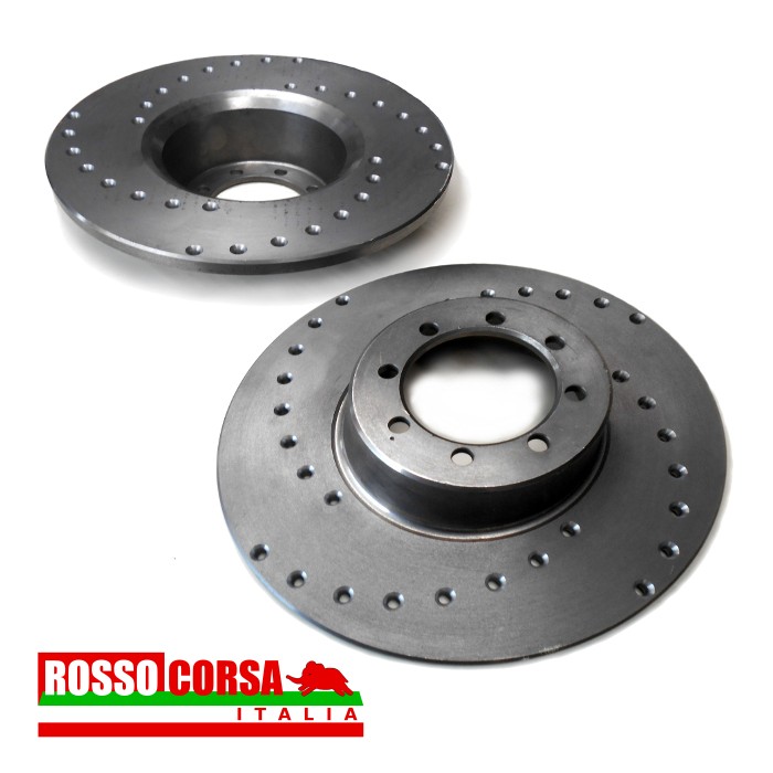 Coppia di dischi freno anteriori forati per Lancia Fulvia, tutti i modelli della 1°serie con impianto Dunlop. Prodotti in Italia, esclusiva di Rosso Corsa Italia