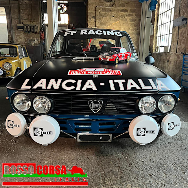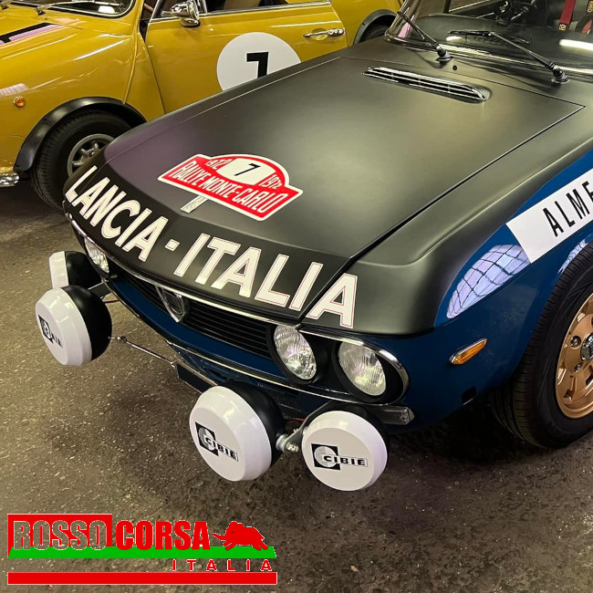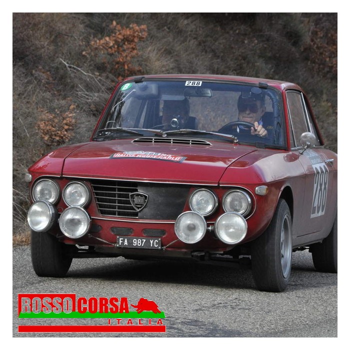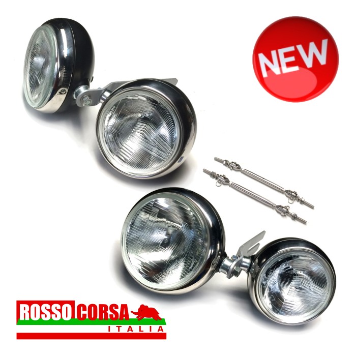 Kit fari supplementari per Lancia Fulvia. Composto da una coppia di fari centrali per illuminare in profondità la strada e una coppia di fari esterni per aumentare la visibilità laterale.