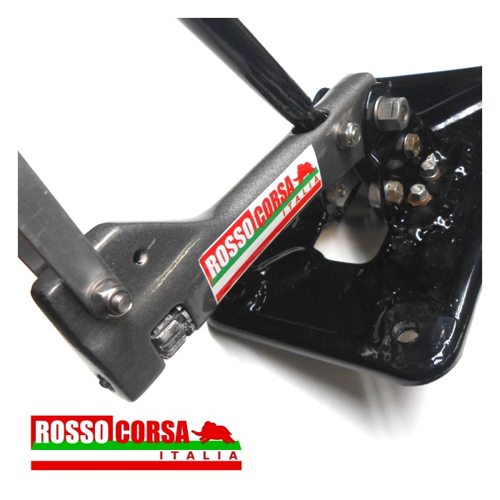 Leva freno a mano modificata per sgancio rapido (Fly-off handbrake) per Lancia Fulvia 1°serie, con prolunga regolabile in inclinazione e lunghezza, bloccaggio manuale a ghiera in posizione di freno di stazionamento. Potrebbe essere necessario un lieve aumento dello spazio di passaggio della leva sul pavimento interno. Modifica consentita dalla Norma Supplementare 14 del Regolamento Nazionale Autostoriche CSAI.