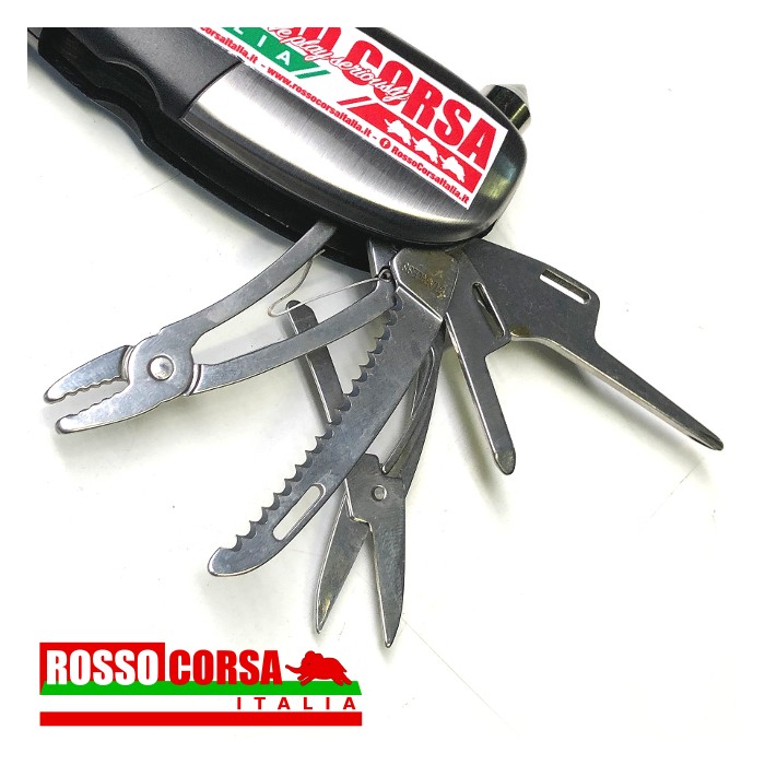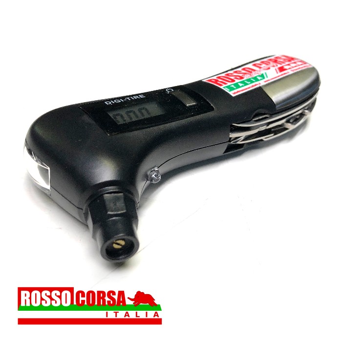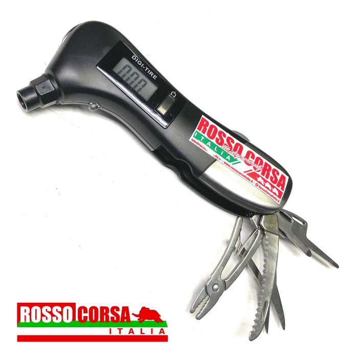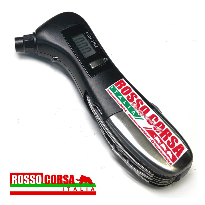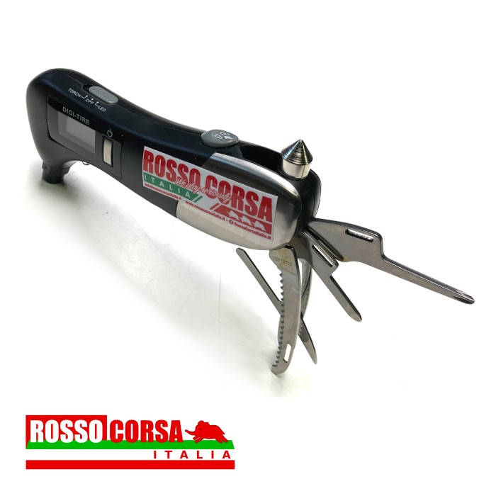Manometro digitale portatile per la misurazione della pressione dei pneumatici. Lo strumento include: torcia a led, luce a led, taglia cinture di sicurezza, martello spacca vetri, forbice, pinza, giravite a taglio e a croce