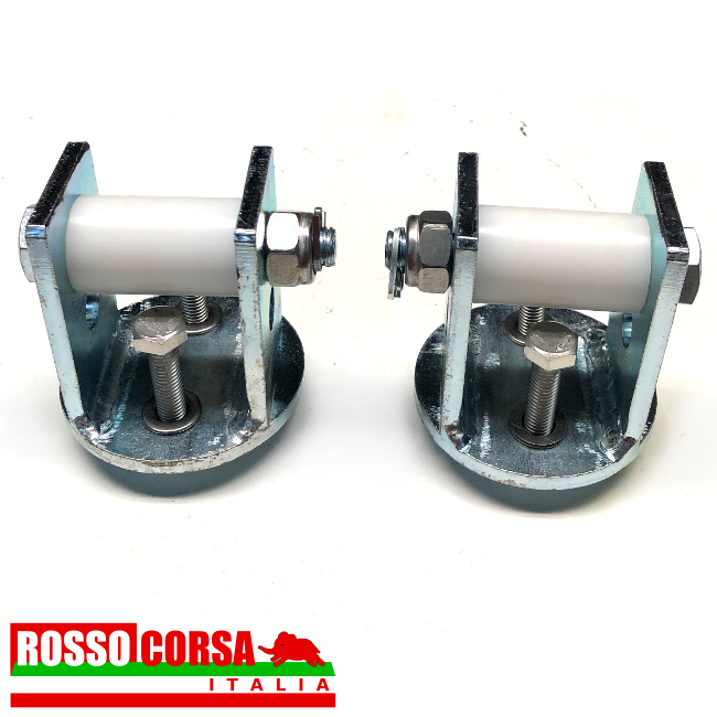 Rulli balestra anteriore per Lancia Fulvia 2°serie, con la traversa in cui alloggia la balestra anteriore lunga, con il tampone fine corsa situato in alto ovvero che agisce sul braccio sospensione superiore. Sostituiscono i tamponi gomma originali. Aumento della scorrevolezza e efficienza della balestra. Facilitano la regolazione dell’altezza anteriore. Con rulli teflon